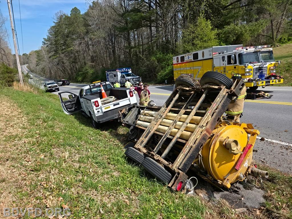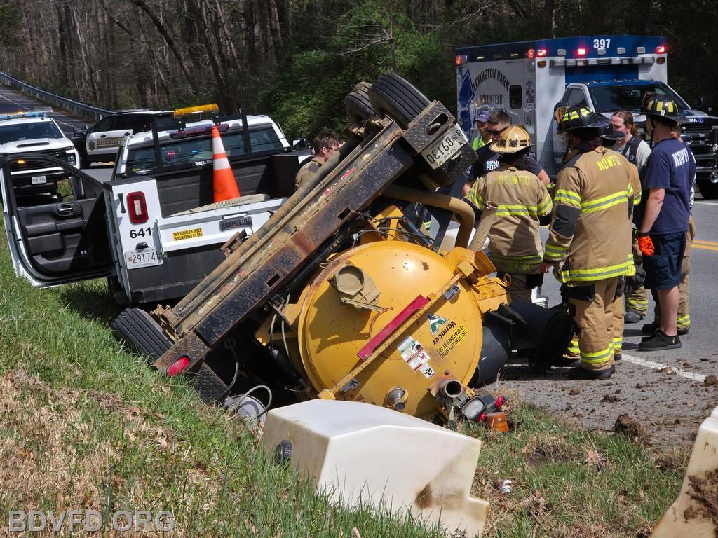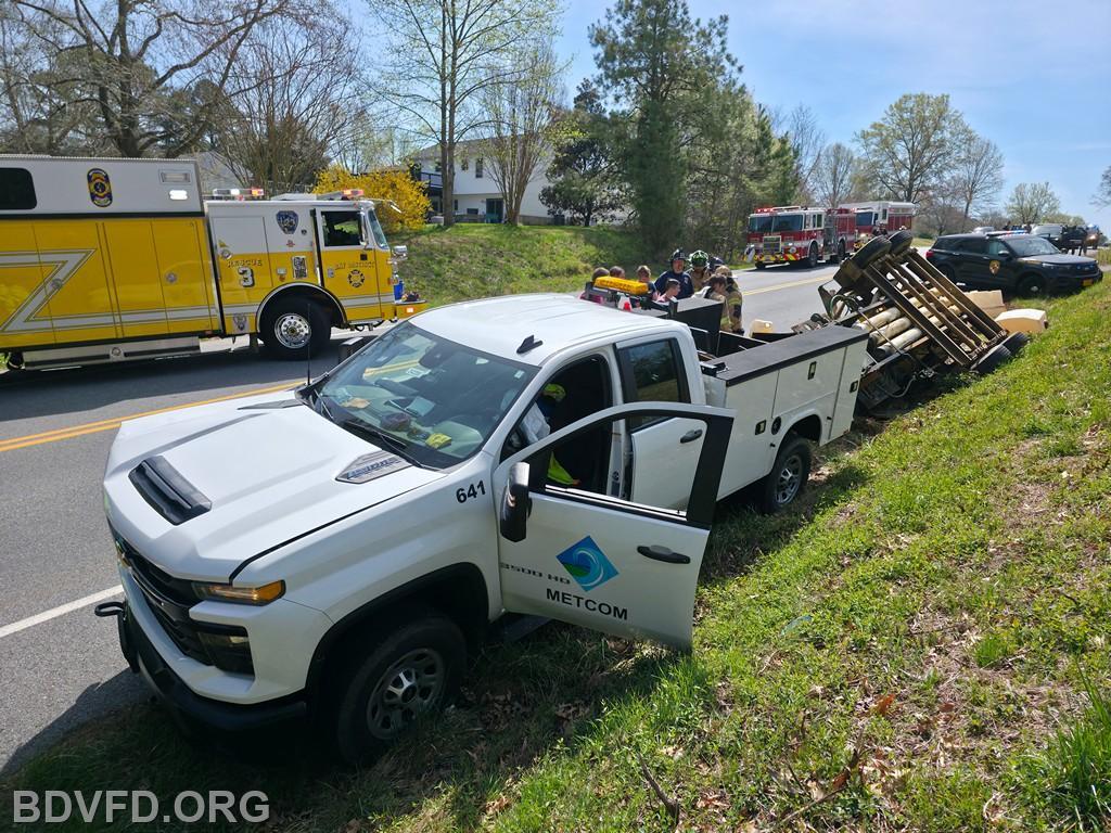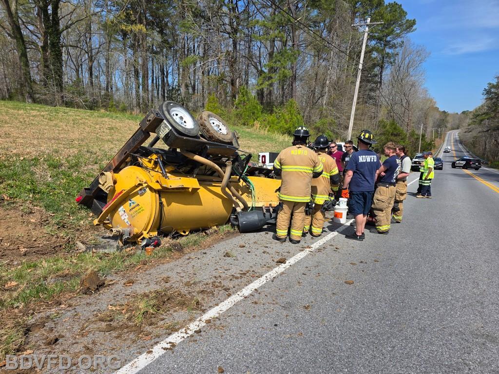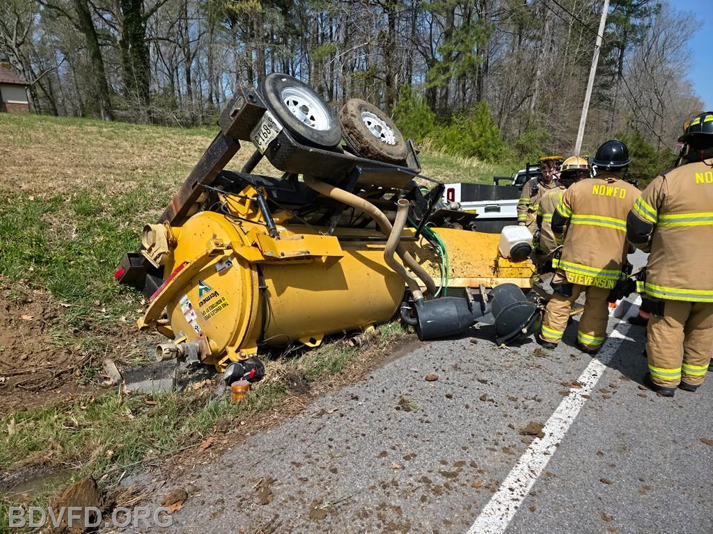 Squad 3 arrived on the scene and conducted an initial size-up, identifying a two-vehicle collision involving a Maryland State Police trooper and a utility truck towing a trailer operated by St. Mary’s County MetCom. The trailer had overturned, resulting in a diesel fuel leak.