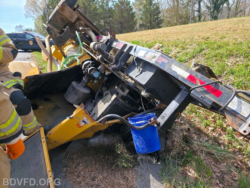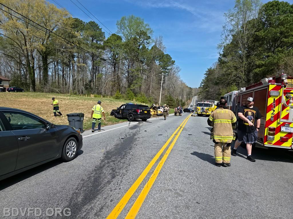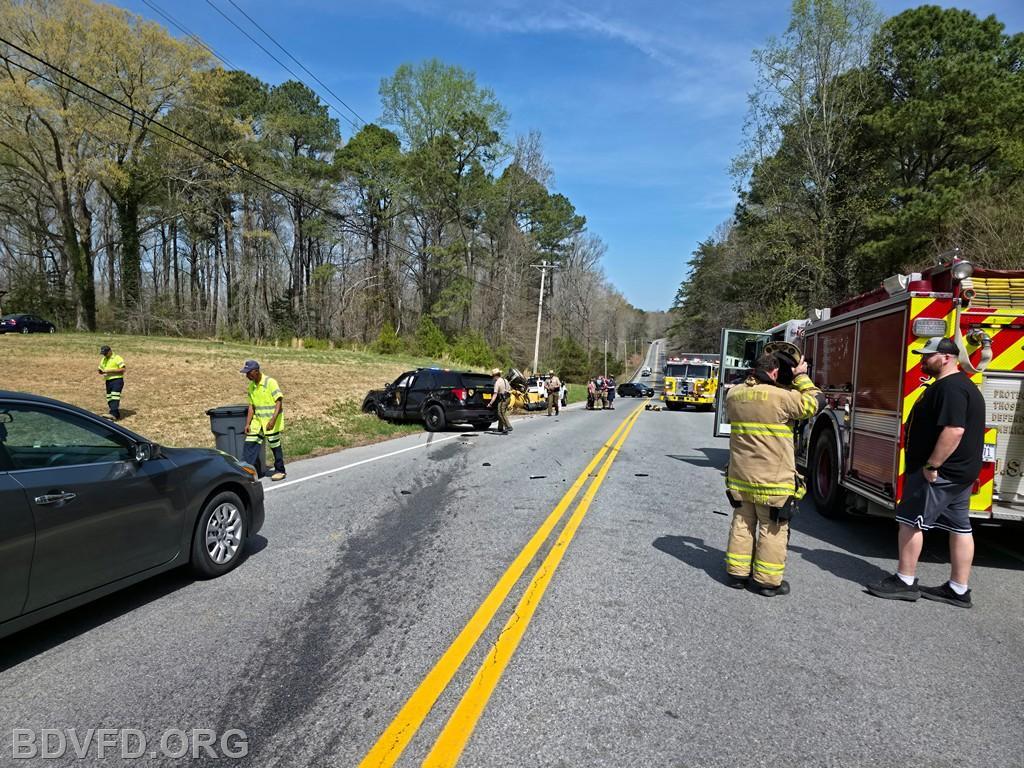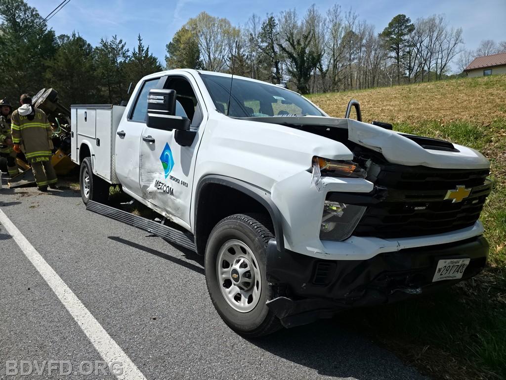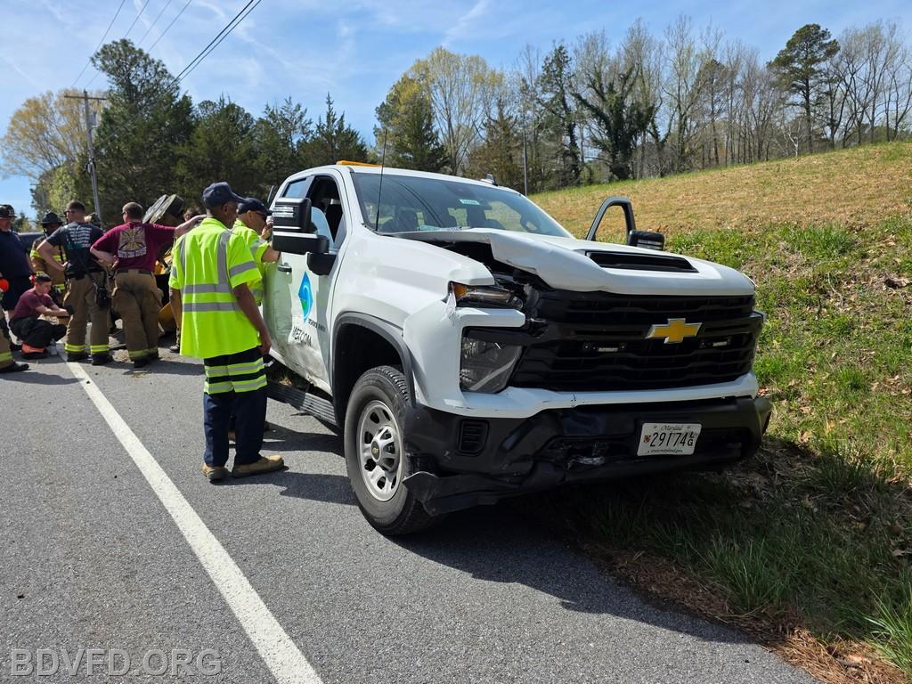 Squad 3 arrived on the scene and conducted an initial size-up, identifying a two-vehicle collision involving a Maryland State Police trooper and a utility truck towing a trailer operated by St. Mary’s County MetCom. The trailer had overturned, resulting in a diesel fuel leak.